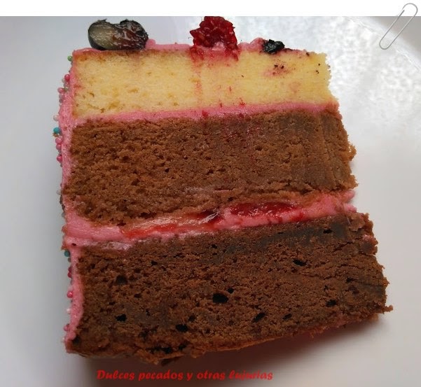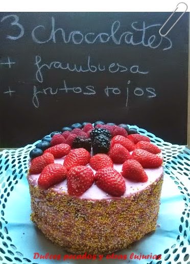 Como puedes leer lleva 3 bizcochos, cada uno de un chocolate diferente, buttercream de frambuesa y frutos rojos frescos.