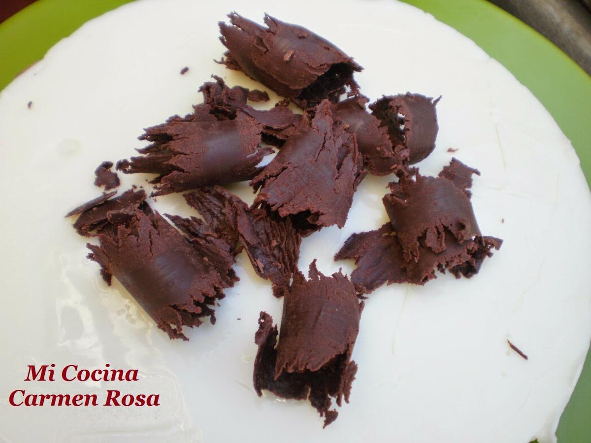 Intenté derretir chocolate, lo hice al baño maria?hasta ahí bien, pero no me salió la flor que quería?.sólo éstos tentadores "rulitos" que le aportaron ese contraste de color a ésta tarta de tres chocolates, que espero disfruten degustándola y preparándola en sus cocinas.