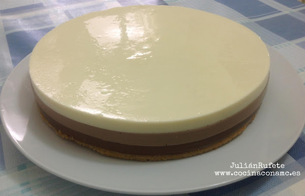 Echamos en un cazo 150 gramos de chocolate con leche, 250 ml de nata (crema de leche), 250 ml de leche, 50 gramos de azúcar y 1 sobre de cuajada. Calentamos todo a fuego medio sin dejar de mover hasta conseguir una crema de chocolate homogénea sin que llegue a hervir. Ahora ya podemos verter esta crema de chocolate con leche sobre la base de galleta (para echar la capa sobre la otra utilizar una cuchara del revés para amortiguar la caída de la crema en la otra capa)