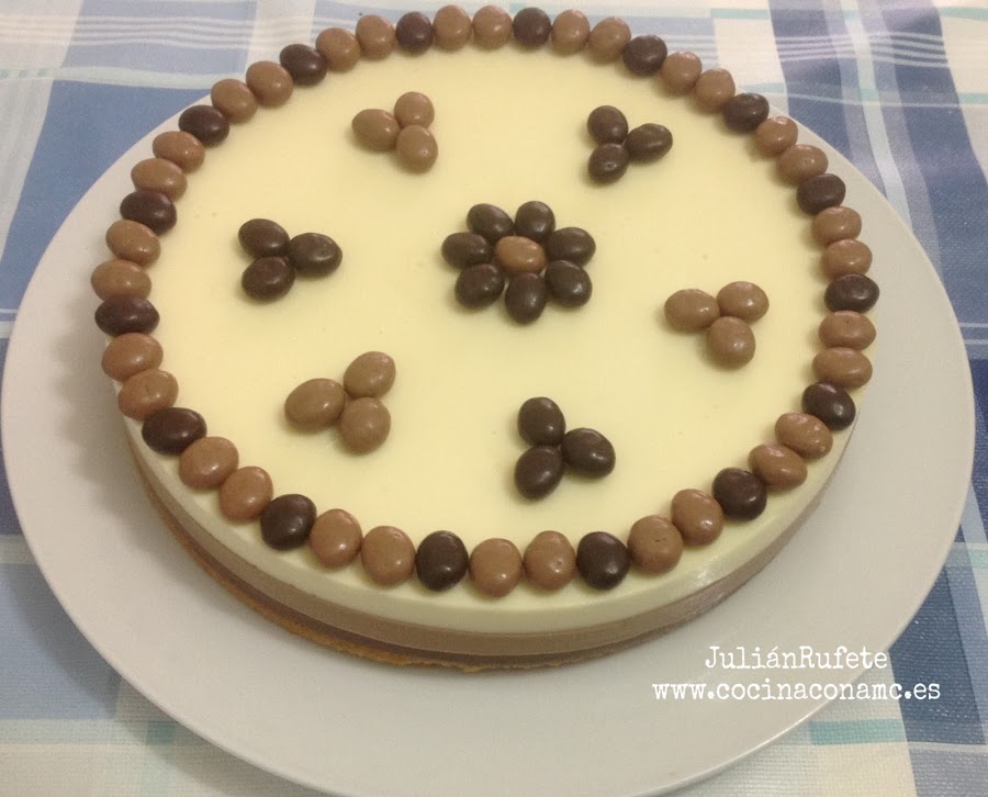 Tarta terminada y dejamos enfriar a temperatura ambiente. Cuando ya este fría, la metemos en la nevera y la reservamos hasta el día siguiente. Al día siguiente, retiramos el aro del molde y podemos adornarla con bolas de chocolate u otros adornos.