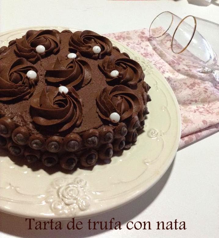 Rellenamos con la nata montada (crema de leche).Cubrimos con la trufa la tarta.Colocamos la trufa restante en la manga pastelera;para las rosas utilizaremos la boquilla 1M de wilton y para los laterales una boquilla lisa.Terminamos de adornar con unas pepitas de chocolate.