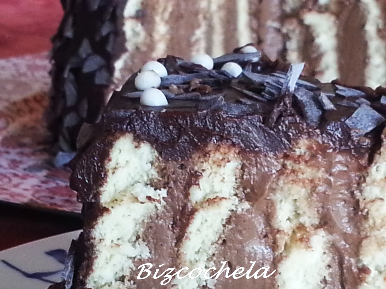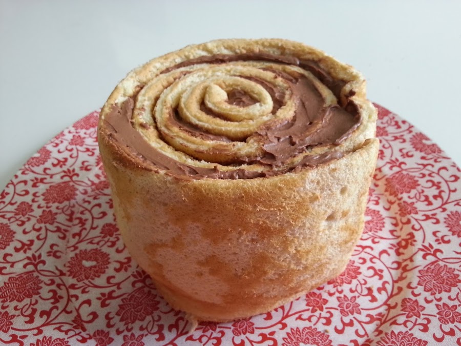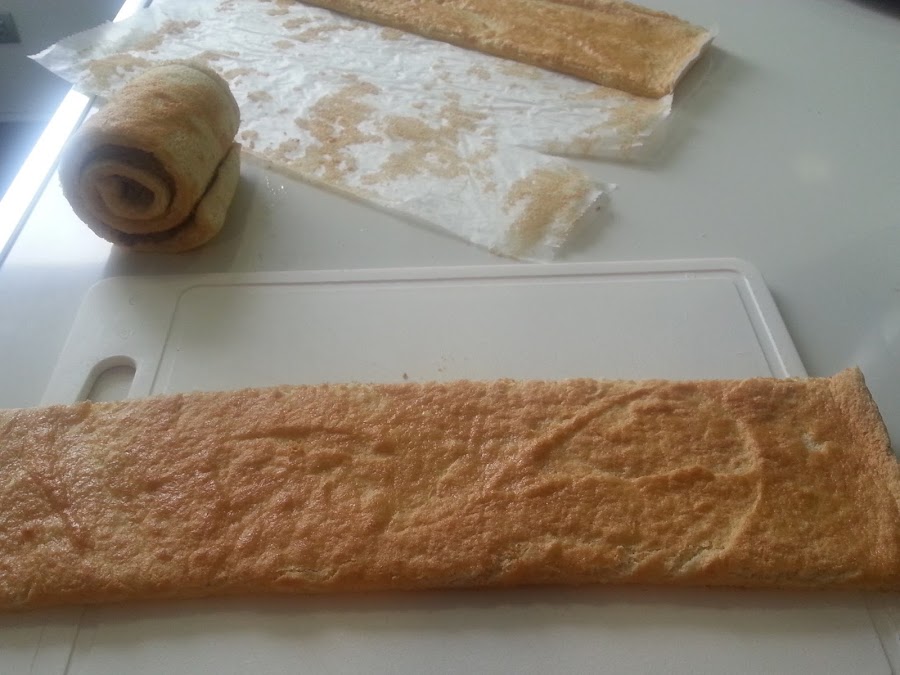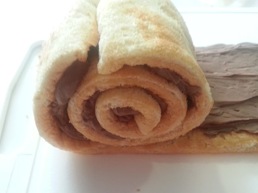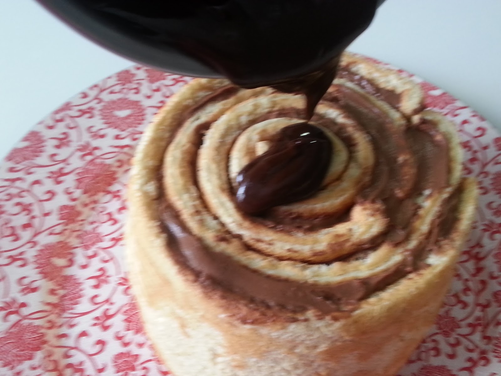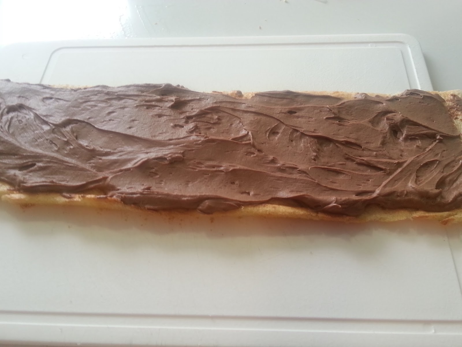 11. - Cogemos otra tira, la cubrimos de trufa y cogemos la que teníamos enrollada, la ponemos encima y seguimos enrollando. Haciendo lo mismo con la tercera tira de bizcocho.