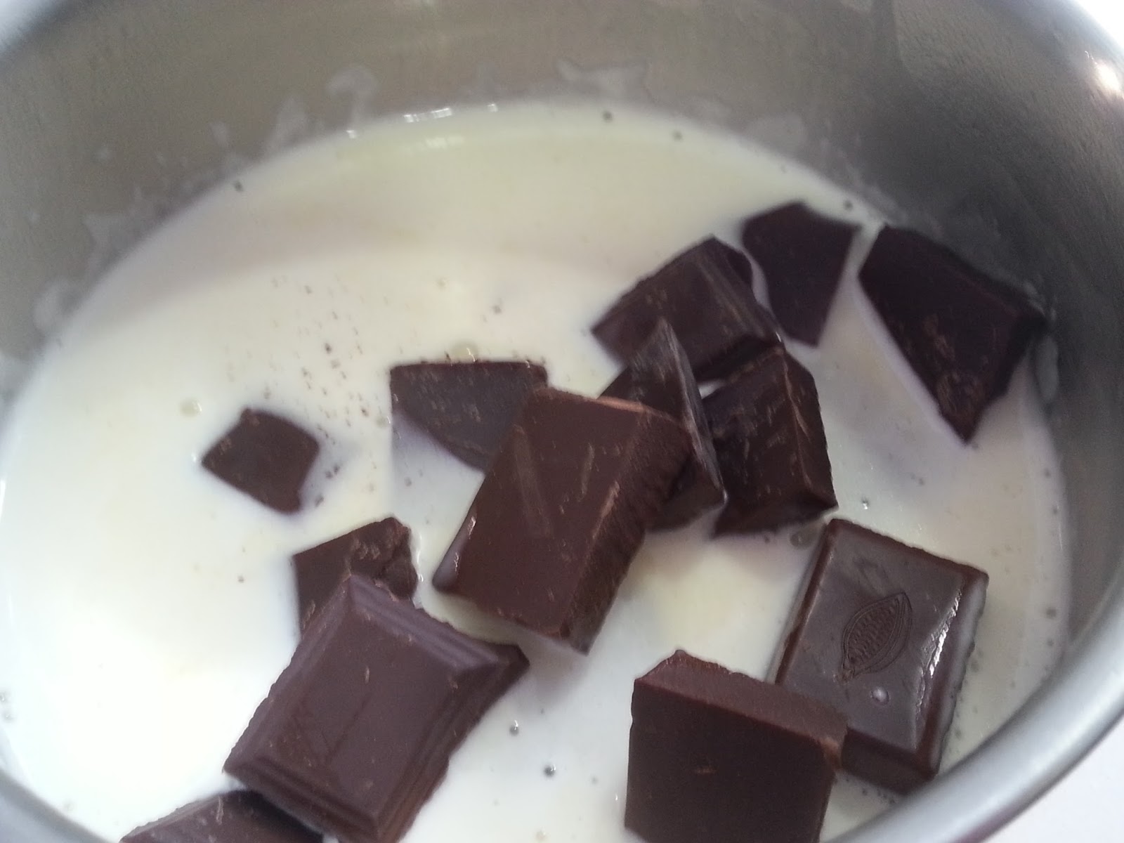 13. - Y pasamos a la cobertura, calentamos la nata (crema de leche) en un cazo, y cuando empiece a hervir, apartamos y le añadimos el chocolate troceado y removemos bien hasta que se disuelva del todo.
