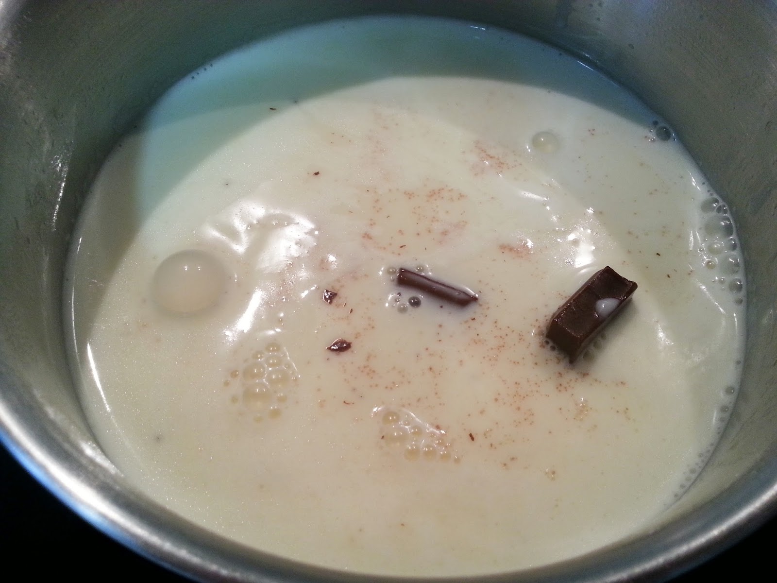 2. - Le añadimos el chocolate troceado y lo removemos hasta que se derrita, y cuando vuelva a hervir, apartamos.