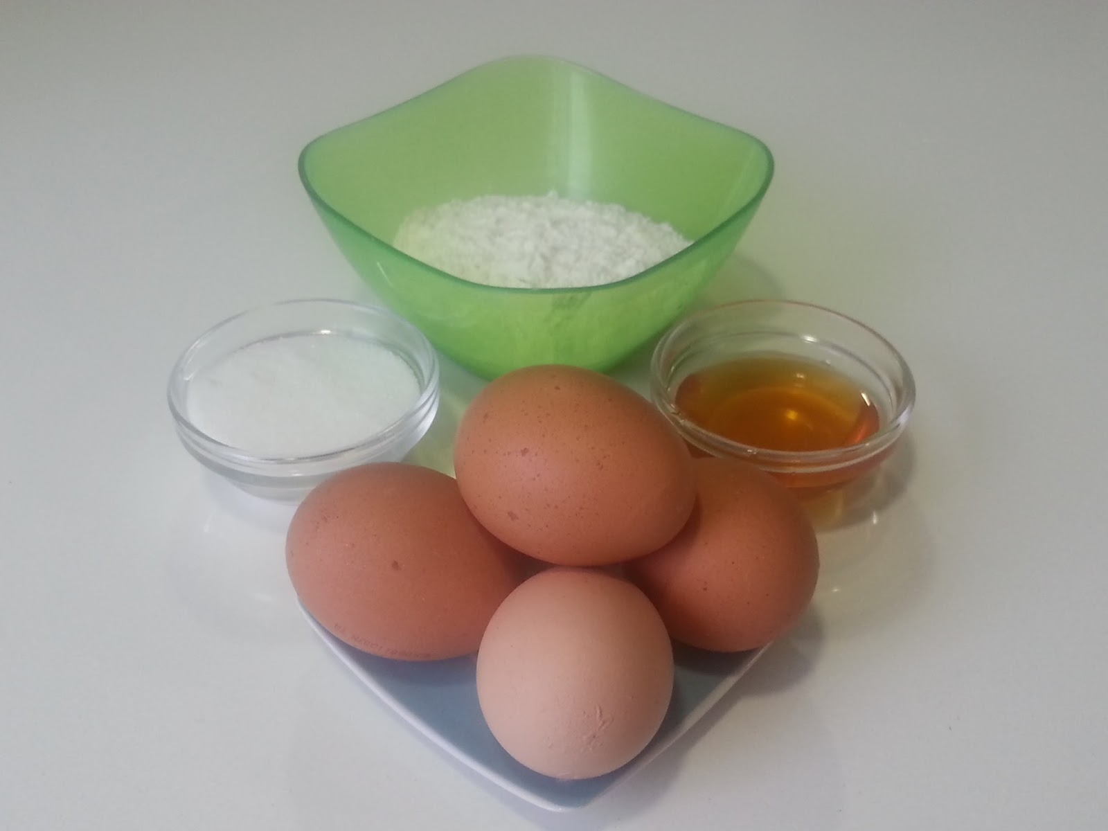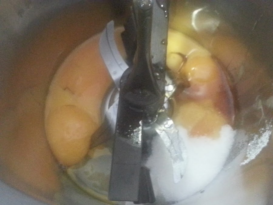 3. - Al día siguiente, o pasadas 6 o 7 horas, pasamos a hacer el bizcocho, precalentamos el horno a 180º y ponemos en un bol o batidora 4 yemas y un huevo entero junto con el azúcar y la miel. Y batimos hasta que suban un poco.