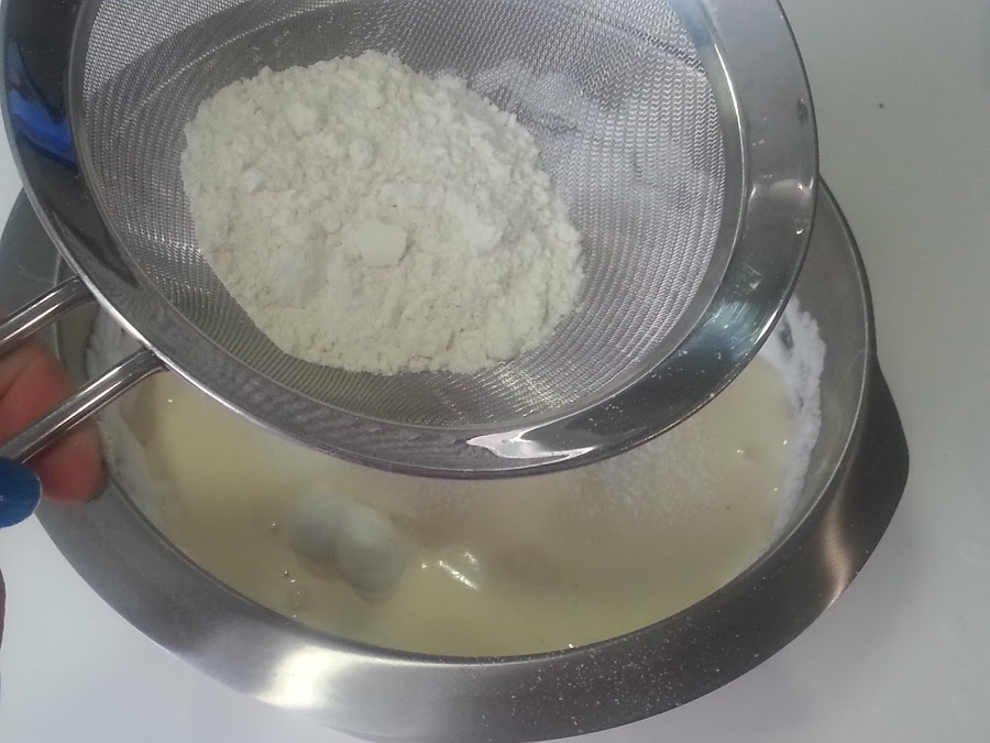 5. - Añadimos las yemas y la harina pasada por un tamiz o colador, y removemos con cuidado para que no bajen.
