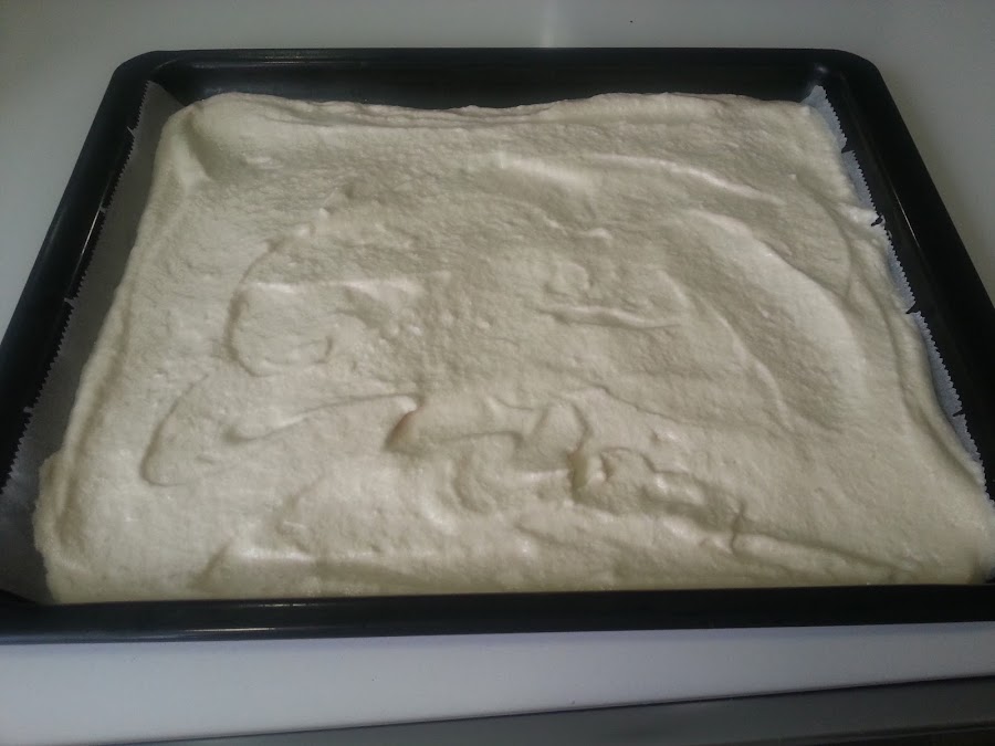 6. - Volcamos la mezcla en la bandeja y extendemos lo más uniforme que podamos. Y metemos en el horno 10 minutos.