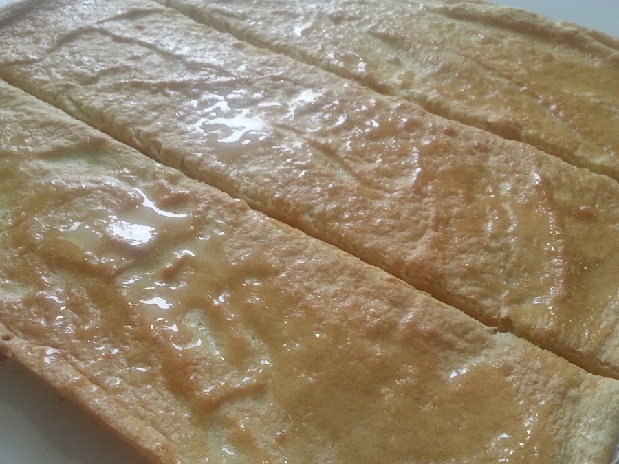 9. - Sacamos el bizcocho del horno, y lo cortamos en tres tiras, lo más iguales posibles, yo lo medí, para que quede uniforme. Y las pintamos con el almíbar.