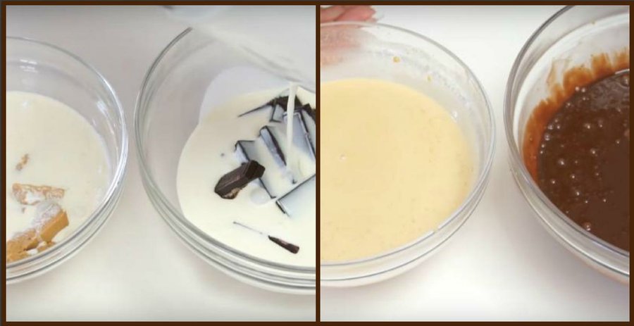 Comienza partiendo el turrón y el chocolate. Ponlos en dos recipientes separados y añade la mitad de nata (crema de leche) a cada uno. Derrite al baño maría y enfría las cremas en el frigorífico.