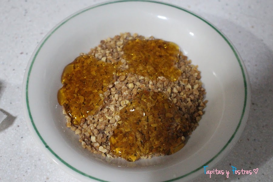 Vertemos la mezcla sobre el molde con la base de galletas. Llevamos al horno, a 180º con calor arriba y abajo. Mientras se va horneando, preparamos la cobertura, simplemente mezclamos las almendras crocantis con la miel y hacemos una pasta.