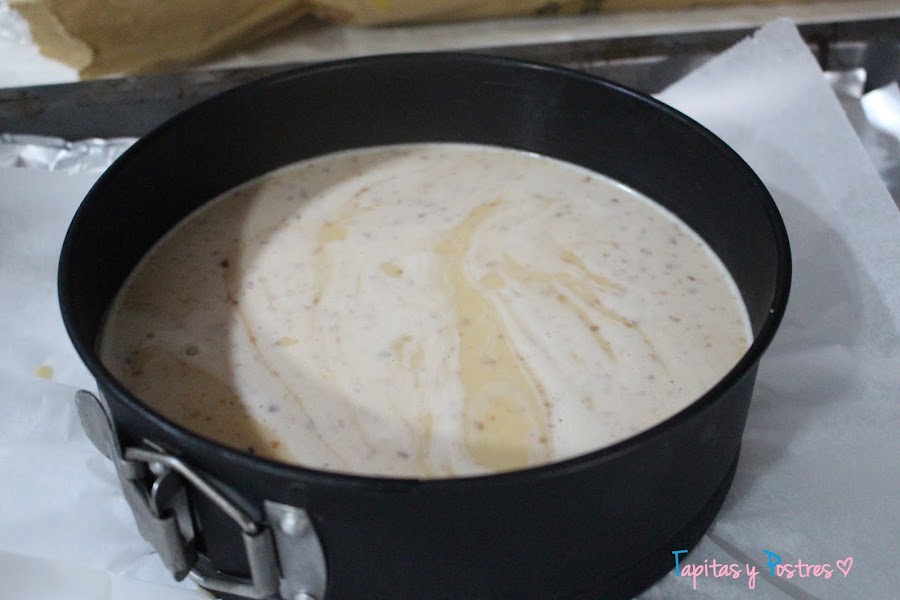 Echamos la mezcla en el molde donde tenemos la base de galletas. Al horno.