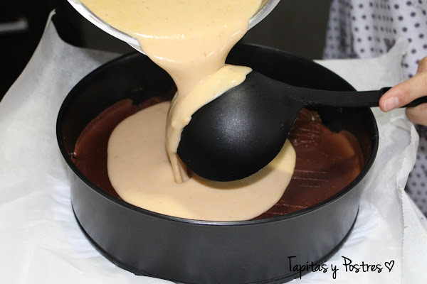 Vertemos la mezcla sobre la base de galletas con cuidado y dejamos cuajar unos diez o quince minutos.