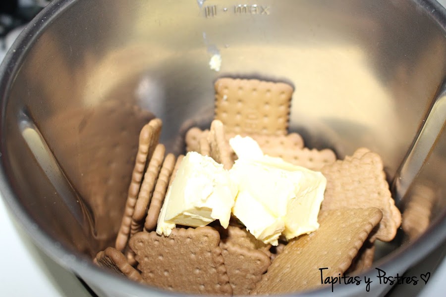 Trituramos las galletas con una picadora o batidora hasta hacerlas polvo y las mezclamos con la mantequilla. Forramos un molde desmoldable y dejamos en la nevera o congelador un rato.