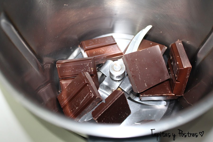 Lavamos el vaso y trituramos el chocolate negro, 5 segundos a velocidad 7-10.
