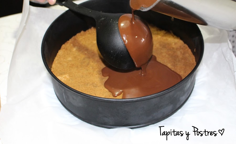 Echamos esta mezcla en un molde desmoldable, cuya base estará previamente forrada con papel vegetal. Aplastamos bien, para que cubra todo el molde. Metemos el molde en el congelador o en la nevera por lo menos media hora.