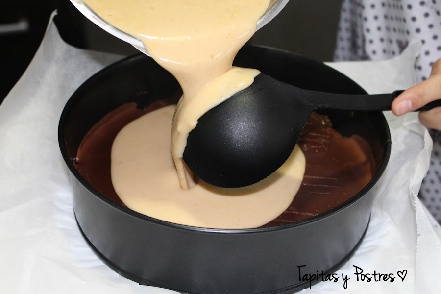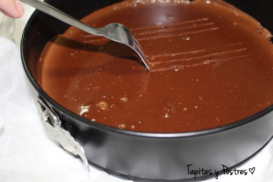 Antes de verterlo sobre la mezcla de chocolate negro, comprobamos con un dedo que ya está cuajada. Entonces le hacemos con un tenedor unas líneas superficiales. Esto es para que la segunda capa se agarre bien. Dejamos que se cuaje esta capa y guardamos en la nevera