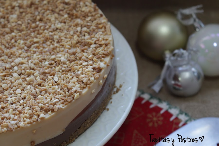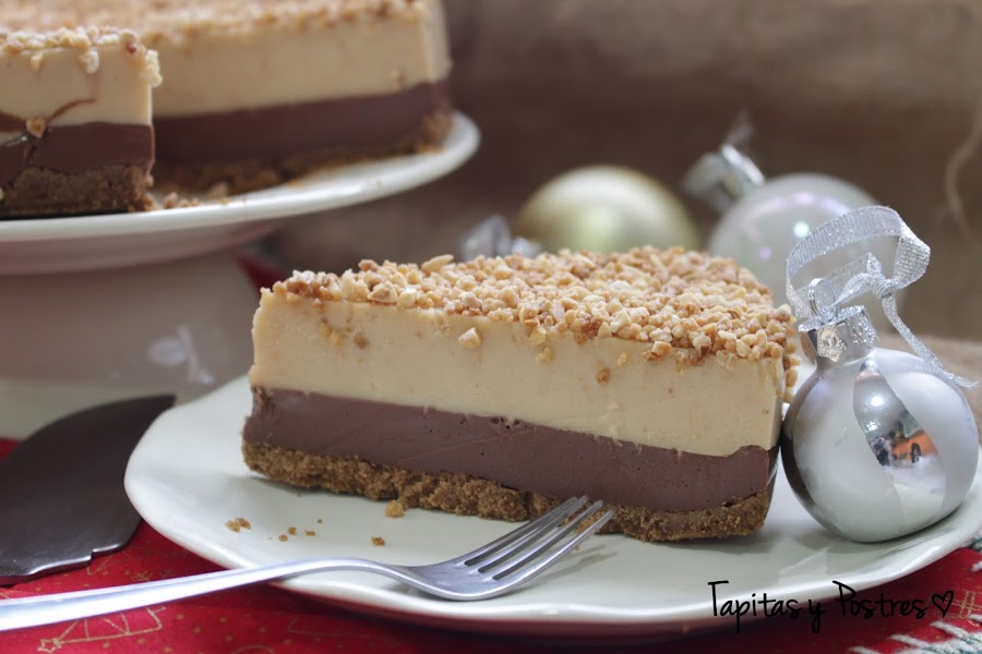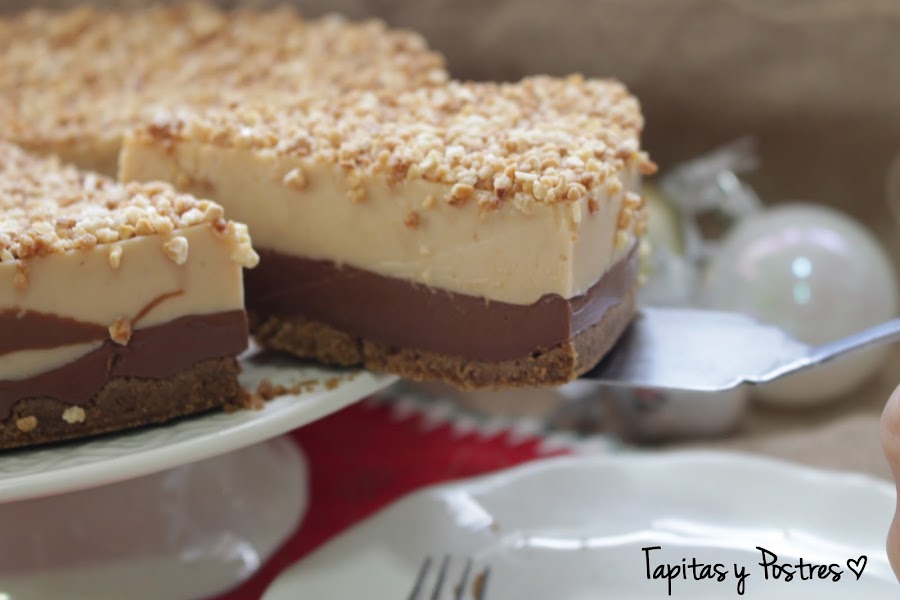 Hoy quiero enseñaros esta tarta maravillosa, adaptación de la archiconocida Tarta tres chocolates, solo que con un solo chocolate y una capa de turrón.