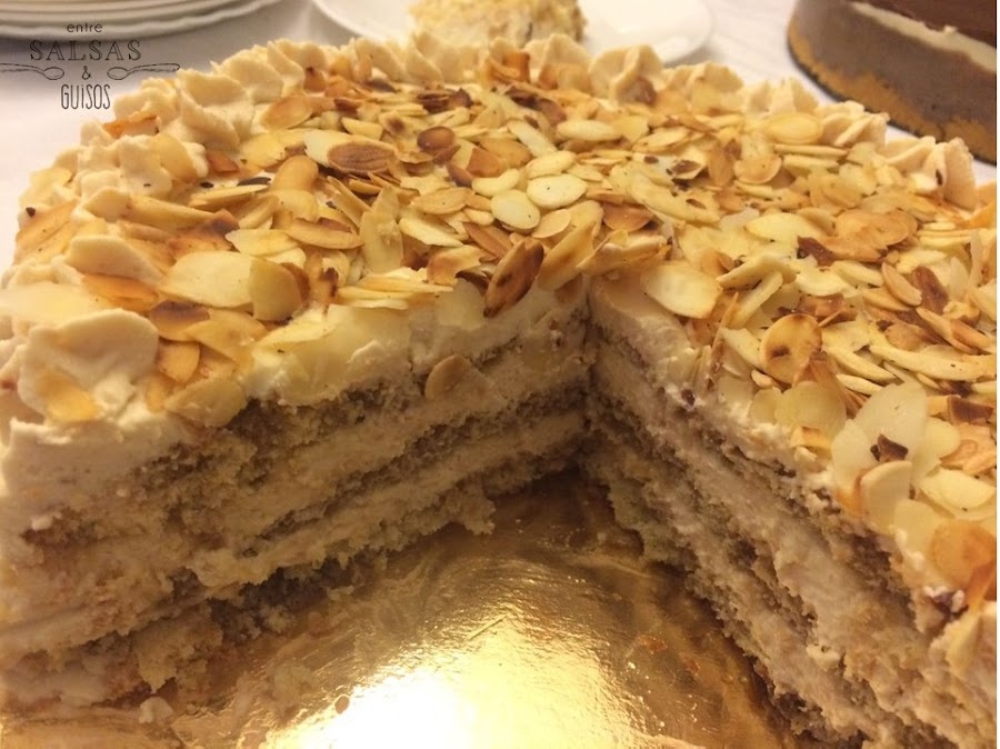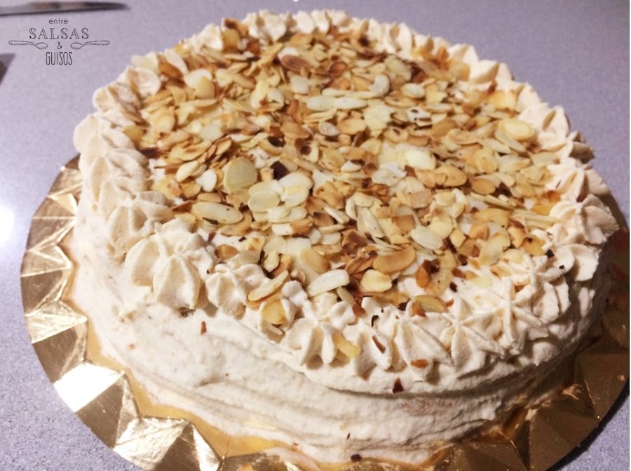 Corta el bizcocho horizontalmente en 3 capas y pon la base del bizcocho en la fuente de presentación. Moja la superficie con 1/3 del almíbar y cubre con una capa de nata (crema de leche) de turrón. Coloca encima otra capa de bizcocho, moja con la mitad del almíbar restante y cubre con nata (crema de leche) de turrón. Pon la última capa de bizcocho, baña con el almíbar restante y decora la superficie y los laterales con la nata (crema de leche) de turrón restante. Por último, reparte las láminas de almendra por la superficie y reserva en el frigorífico durante aprox. 1 hora.