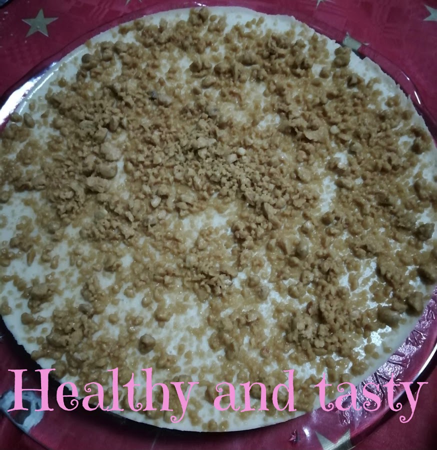 Cuando la tarta esté cuajada, la decoramos como queramos. Yo he desmenuzado turrón blando pero podéis decorarla con lo que más os guste : almendras crocantis, fideos o bolitas de chocolate, etc.