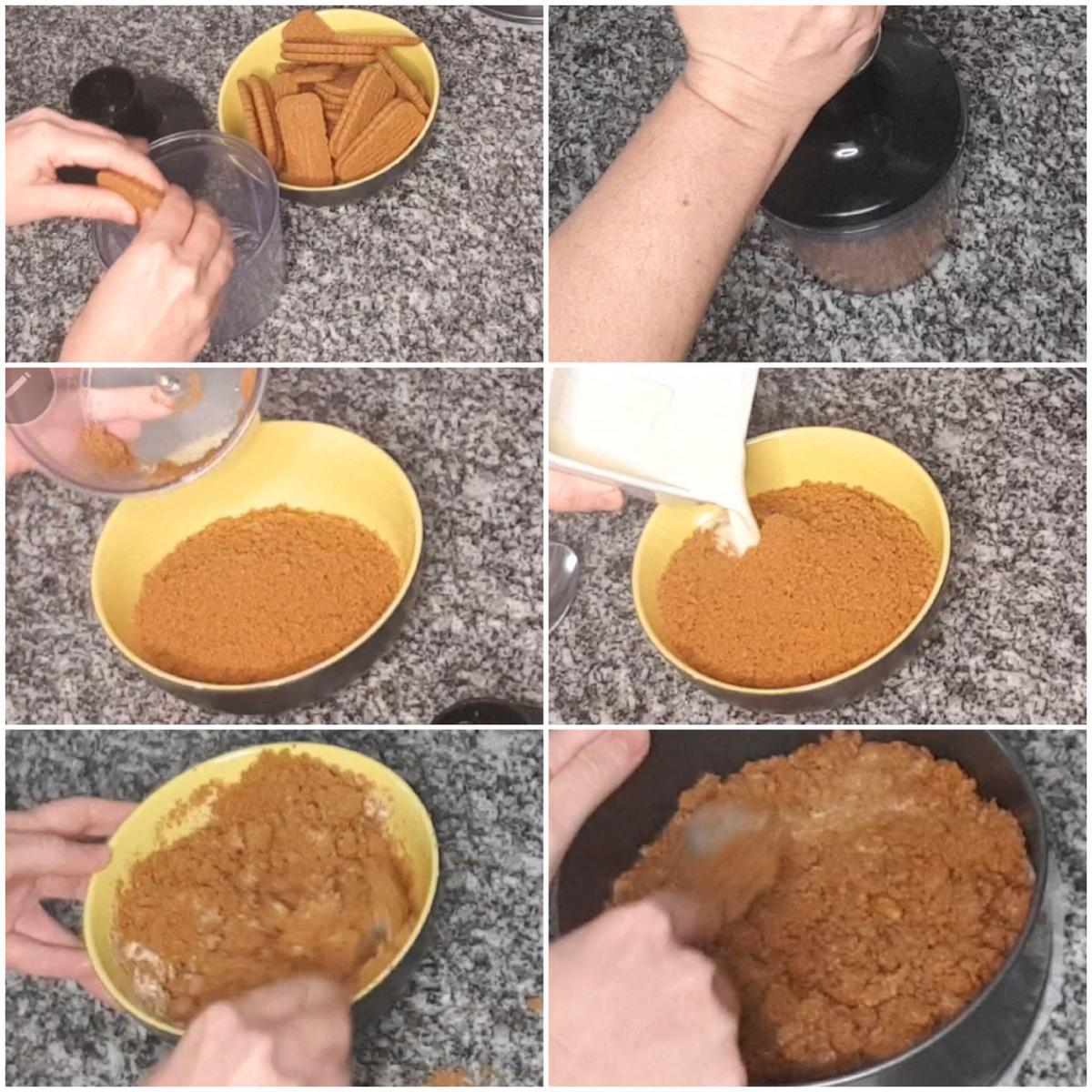 Tiempo necesario: 30 minutos.Preparar la base Molemos las galletas con ayuda de una picadora. Derretimos la mantequilla y se la vertemos a las galletas. Mezclamos todo bien. Luego cubrimos la base del molde con las galletas, y con la ayuda de una cuchara presionamos bien para que quede todo compacto. Reservamos el molde con la capa de galletas en el refrigerador hasta que lo necesitemos.