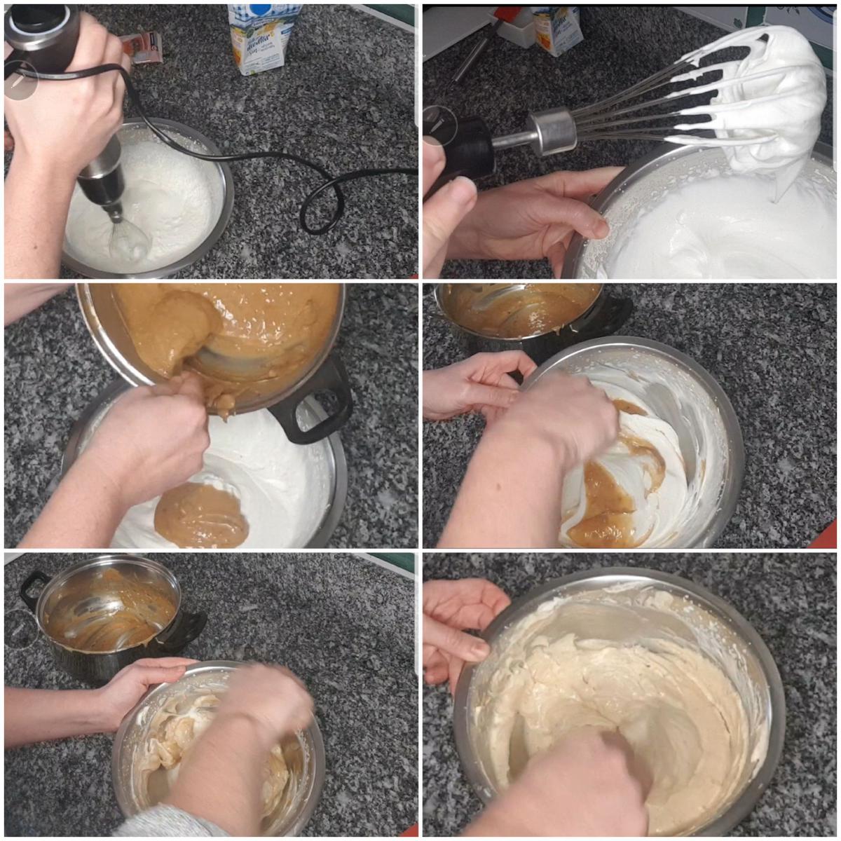 Montar la nata (crema de leche) Semi montamos la nata (crema de leche) con el azúcar. La nata (crema de leche) no tiene que estar montada del todo, tiene que quedar con los picos suaves y flexibles. Añadimos la crema de turrón, que ya le habrá bajado un poco la temperatura, en tres veces, mezclando con una espátula con movimientos envolventes.