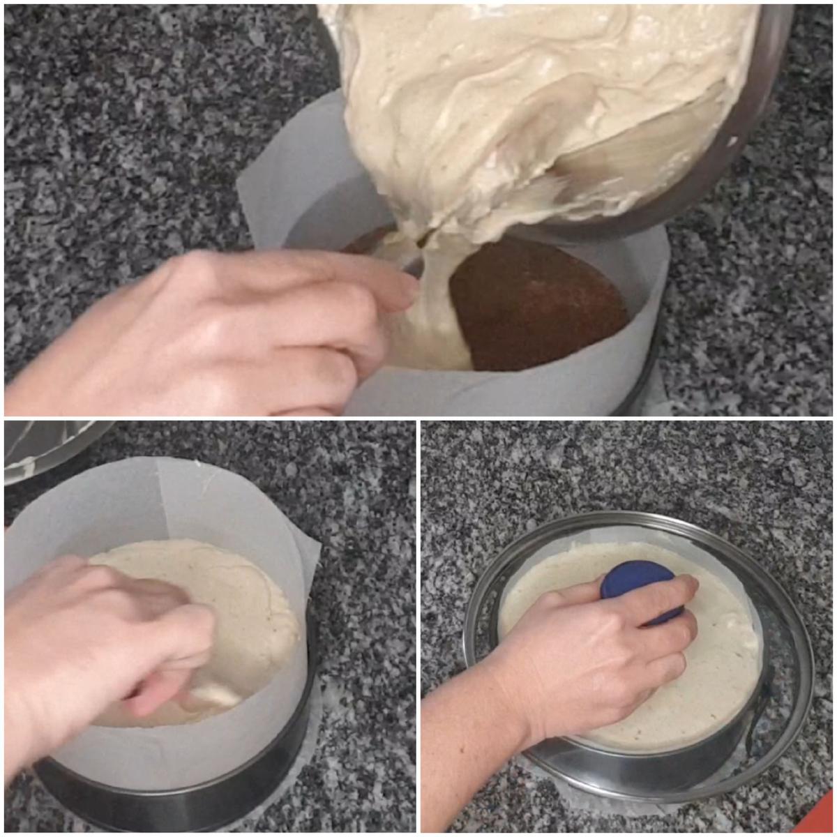 Como podéis ver en la imágenes yo forro el molde con papel de horno tanto la base como por las paredes, para mí, me resulta mucho más fácil después desmoldarla, y a parte los lados quedan más parejos y lisos.