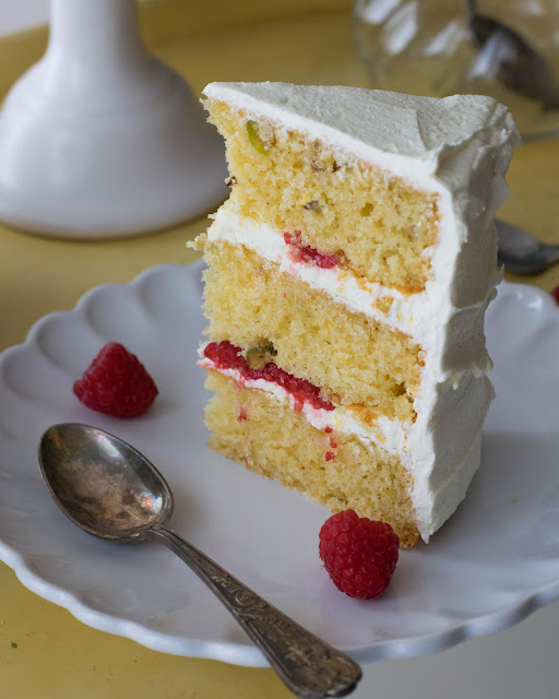 Tarta de vainilla, pistachos, frambuesa, chocolate blanco y limón