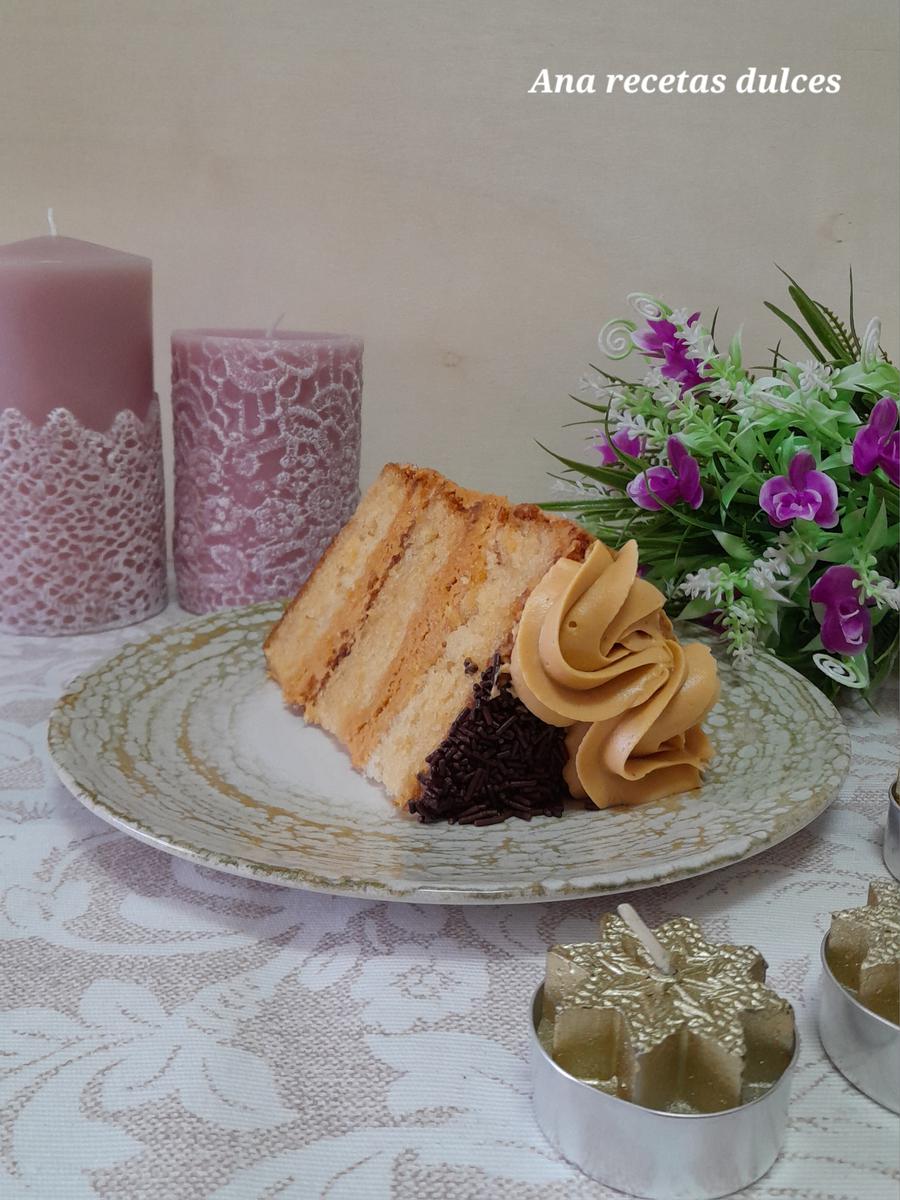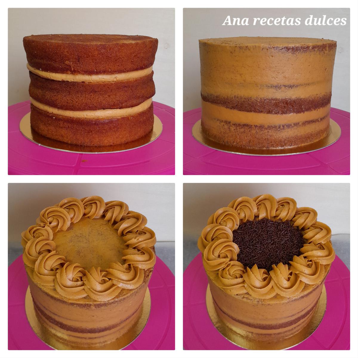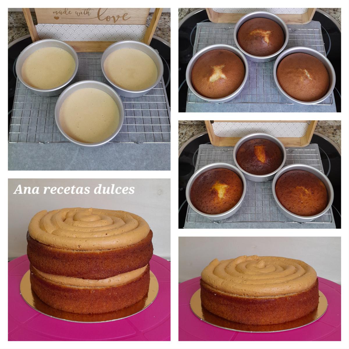 En este caso, los bizcochos son de vainilla, mojados con almíbar y rellenos con buttercream de dulce de leche.