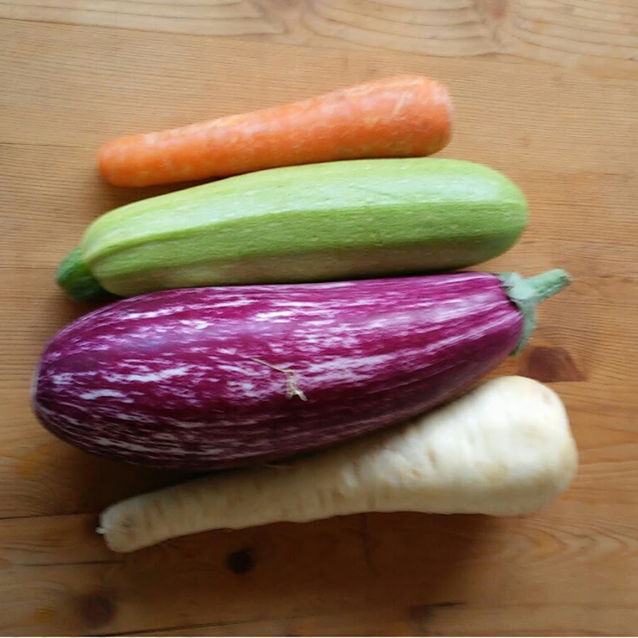 . Una berenjena, un calabacín, zanahorias y chirivías.
