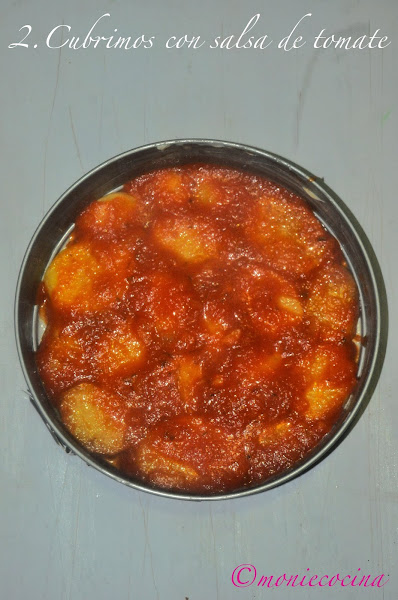 Cortamos la berenjena y repetimos la misma operación, freímos, colocamos en el molde y cubrimos con salsa de tomate.