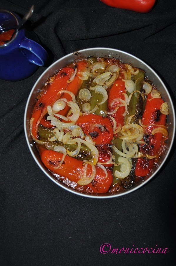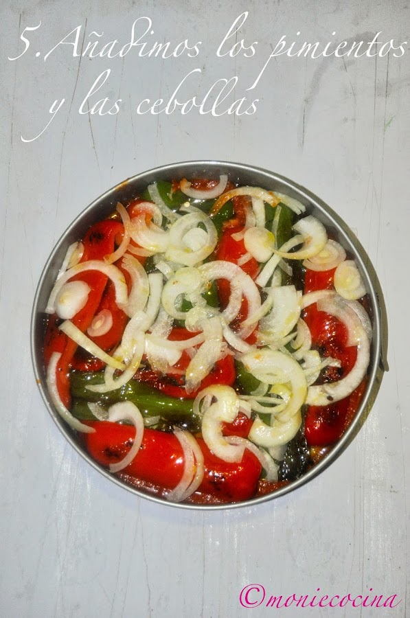 Por último freímos el pimiento verde y rojo cortado en tiras anchas, limpios sin pepitas, colocamos en el molde y por último la cebolla, esta sin freír porque se hará en la parte de arriba de la tarta.