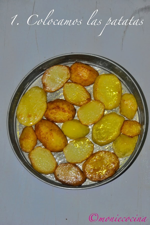 Empezamos con las verduras, primero cortamos en rodajas gorditas las patatas, las freímos unos 3 minutos por cada lado y sacamos. Las colocamos en el molde.