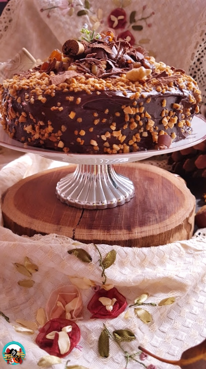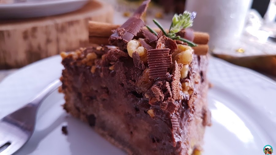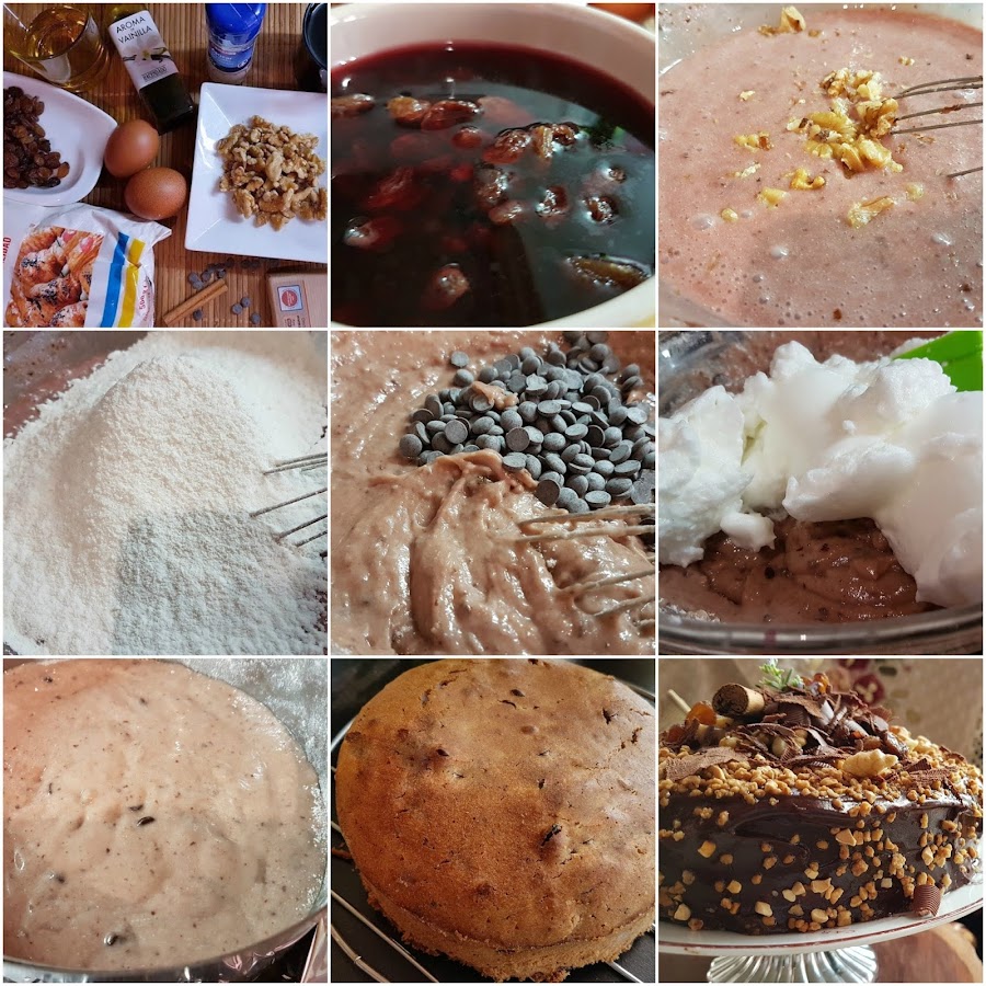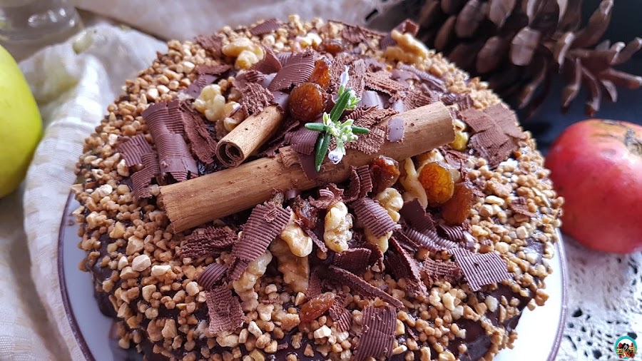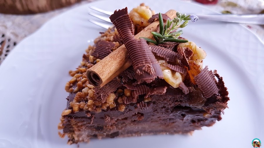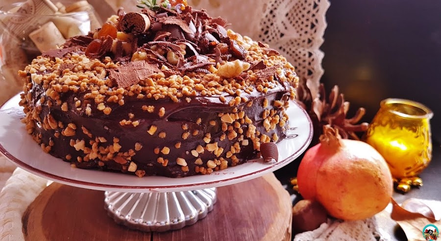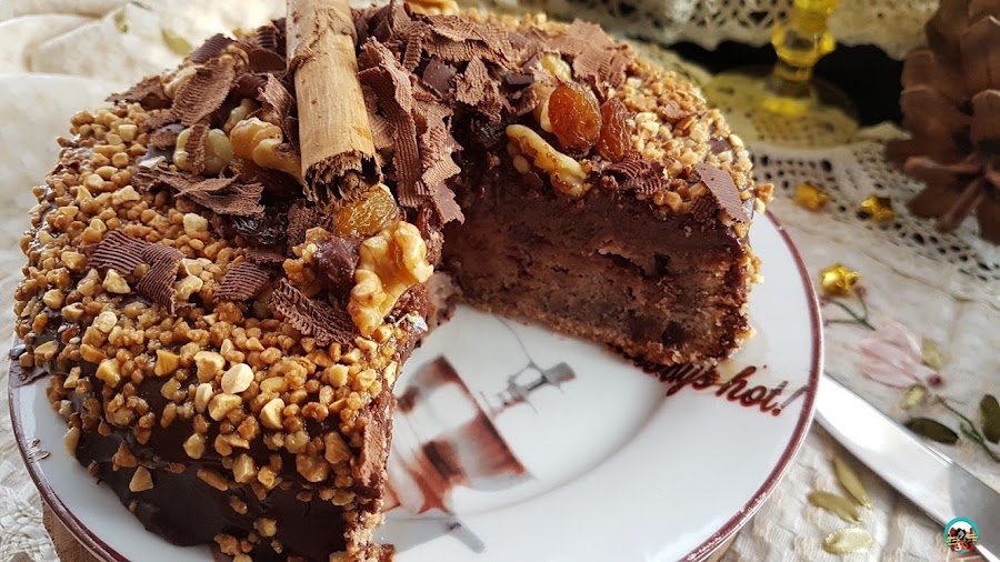 Una tarta con un bizcocho lleno de tropezones de frutas y frutos secos. Donde en vino tito se funde con el cacao y los chips de chocolate.