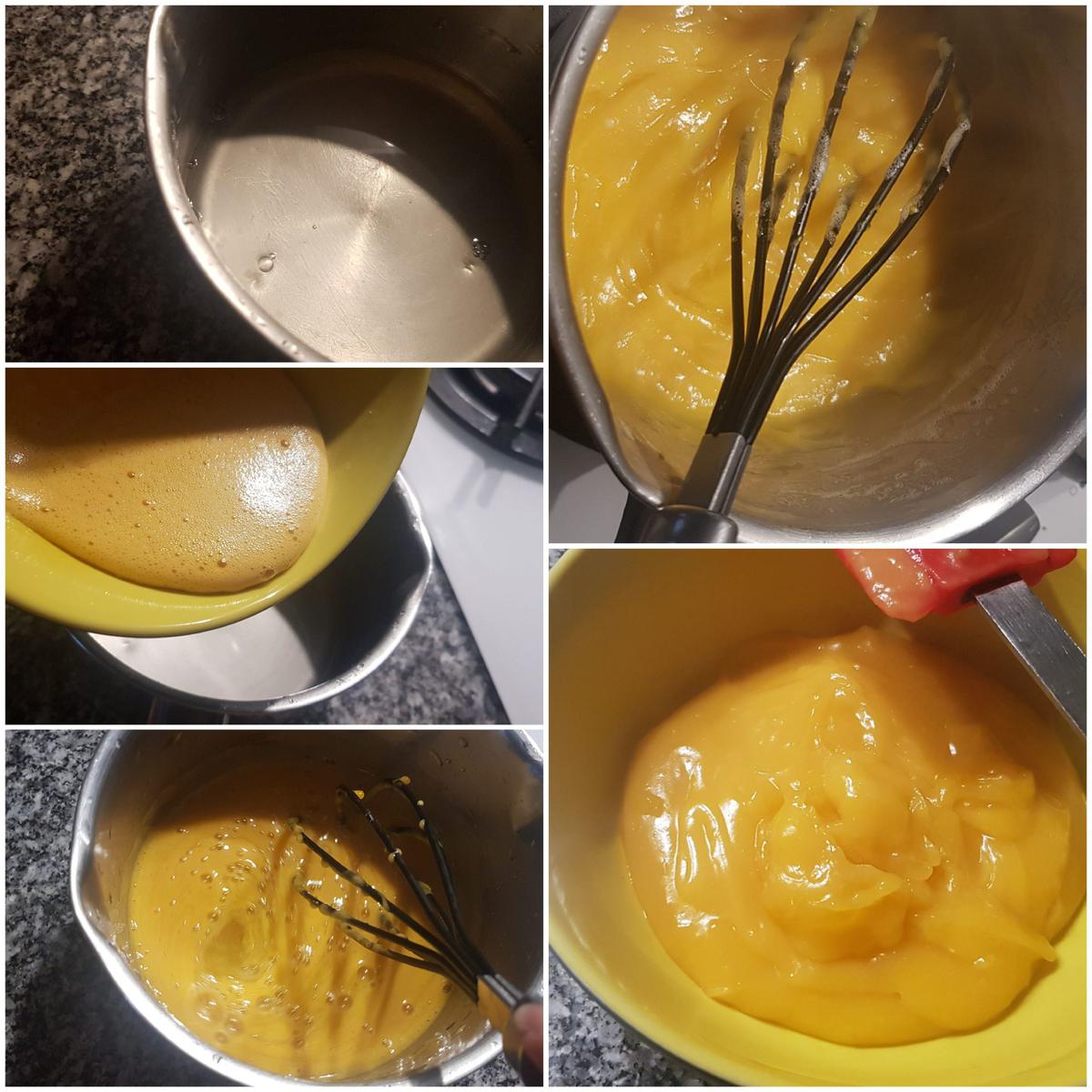 Cocinar la crema de yema Pondremos en un cazo a calentar el agua, con el azúcar y dejamos hervir durante 5 minutos y retiramos del fuego para que temple un poquito. Por otro lado en un cuenco ponemos las yemas con la maizena y mezclamos con la ayuda de unas varillas, una vez bien mezclado echamos las yemas en el cazo del agua que habrá enfriado y lo volvemos a llevar al fuego, sin dejar de remover hasta que espese. Hacerlo a fuego medio-bajo. Cuando espese sacamos del fuego y le añadimos la esencia de vainilla y removemos para que se integre bien. Y reservamos.