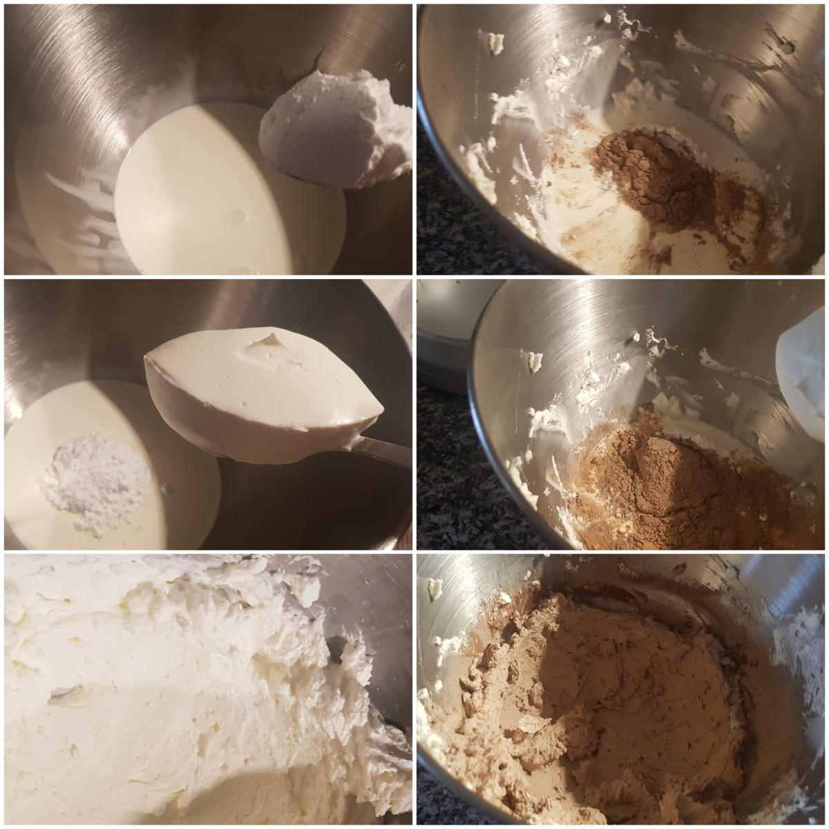 Montar la nata (crema de leche) y la trufa Primero la nata (crema de leche) y así no tendréis que lavar el bol y las varillas dos veces. Metemos los ingredientes en la batidora y batimos a velocidad alta unos minutos. En mi batidora costó 4 minutos. Montamos la nata (crema de leche) y la trufa y reservamos.