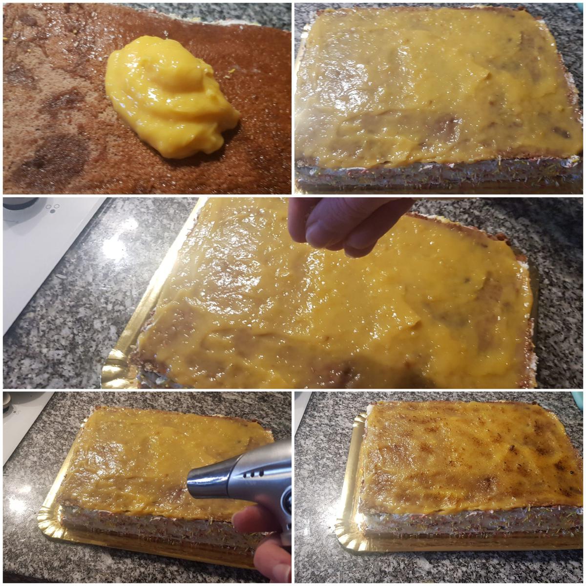 Por si os interesa deciros que las medidas de los bizcochos son de 20×18. También comentaros que yo tosté la yema con un quemador, pero que si no tenéis quemador, la yema está igual de buena.