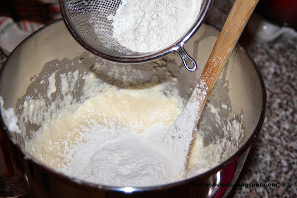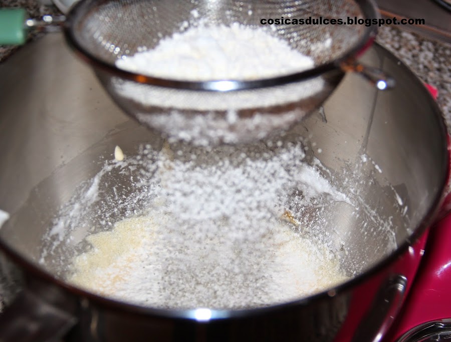 Comenzamos preparando el bizcocho (a mi me gusta hacerlo el día de antes para que se asiente la miga). Para hacer el bizcocho comenzamos batiendo las yemas con el azúcar hasta que blanquee. Una vez que hayan doblado su volumen tamizamos sobre ellas la mezcla de la harina y la maizena. Pero, ojo, sólo debemos añadir la mitad.