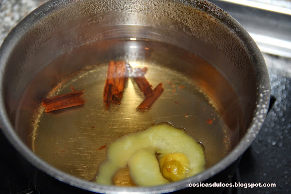 Mientras la crema enfría aprovechamos para preparar el almíbar. Es tan sencillo como colocar en un cazo el agua, el azúcar, el limón y la canela. Cuando empiece a hervir añadimos el chorrito de coñac y dejamos un par de minutos más hasta que se evapore el alcohol.