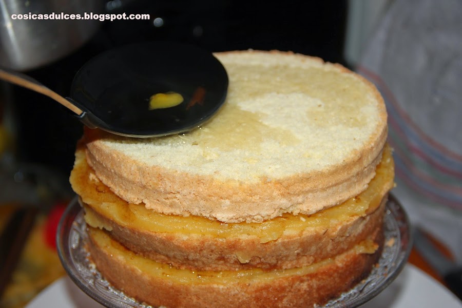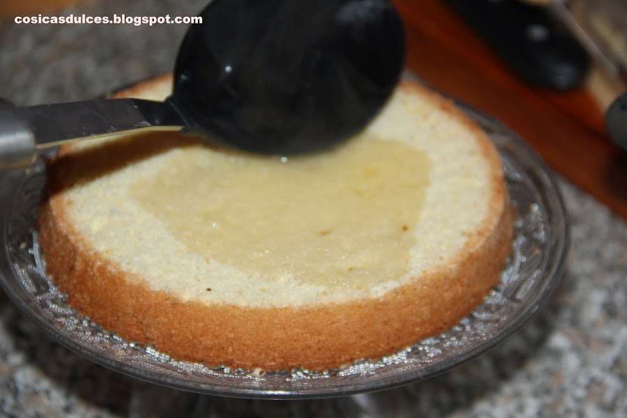 Procedemos ya al montaje de la tarta. Con ayuda de una lira o cuchillo cortamos el bizcocho en tres discos. Colocamos el primero de ellos y calamos generosamente con almíbar.