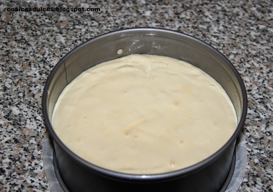 Vertemos la mezcla en el molde y comenzamos el proceso de horneado que debe seguir los siguientes pasos. Inicialmente horneamos nuestro bizcocho (con el horno precalentado) durante 30 minutos a 160 grados y con calor sólo por abajo. Después de ese tiempo horneamos 10 minutos más a igual temperatura pero con calor arriba y abajo. Transcurridos esos 10 minutos apagamos el horno, entreabrimos la puerta y dejamos el bizcocho así durante cinco minutos. Por último abrimos totalmente la puerta y dejamos el bizcocho dentro del horno (y con la puerta totalmente abierta) cinco minutos más. Todas estas indicaciones de horneado las he tomado del blog Cupcakes a diario.