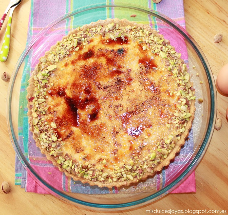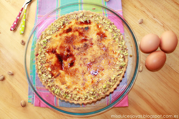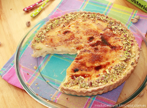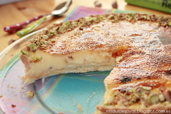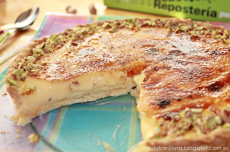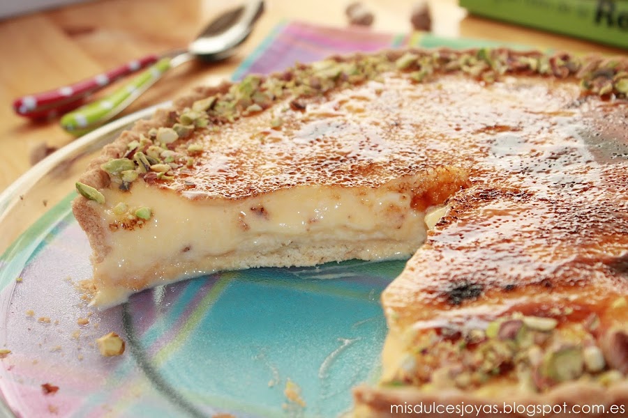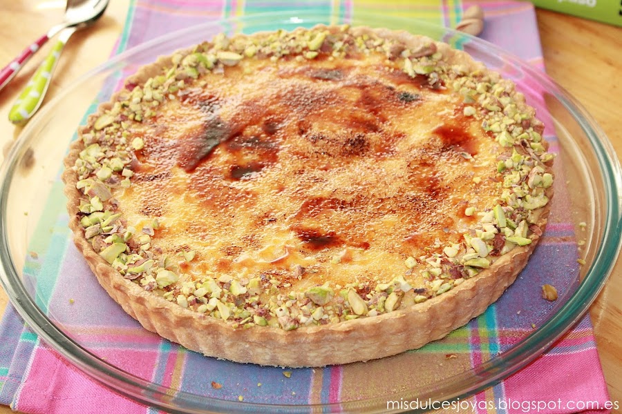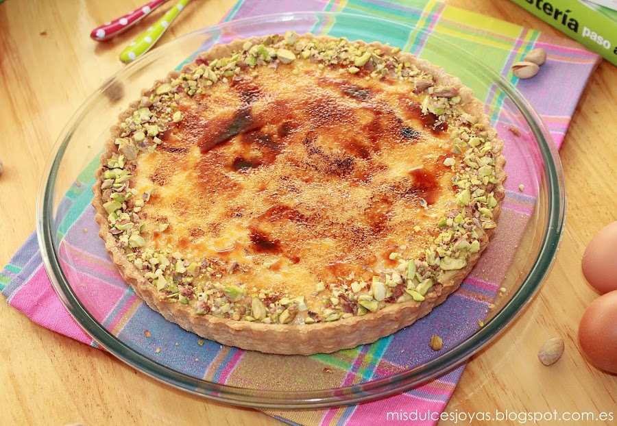 Es una de las favoritas de mi marido, contiene todos los componentes que a el le gustan: crema pastelera, crema de yema, caramelo y masa quebrada. Le vuelve loco el crujiente del caramelo y de la masa quebrada, también el contraste de texturas, además se la adorno con pistachos troceados que son sus frutos secos preferidos, y como podéis imaginar lo tengo ganado...)