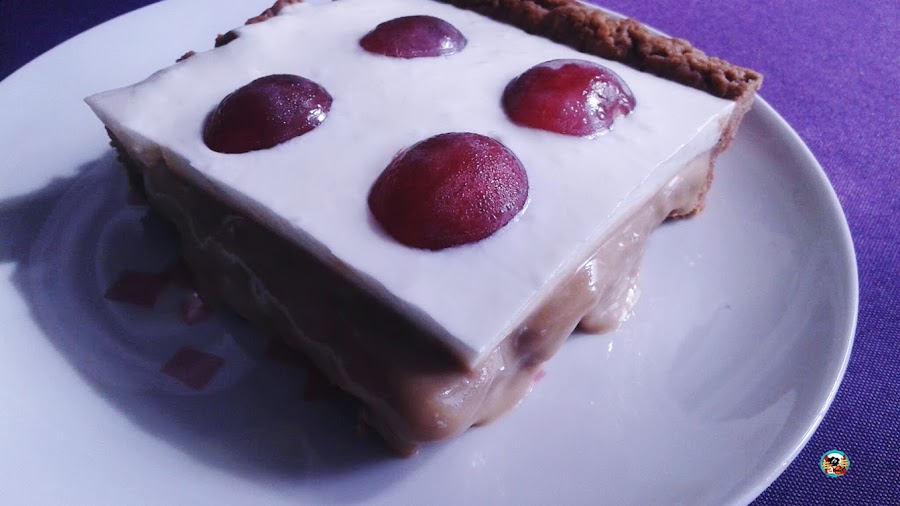 Cuando hablamos de tarta de yogur, estamos acostumbrados a ver otro tipo de tarta. La imagen que nos viene a la cabeza es de una tarta fría redonda tipo mousse...Esta no es así, hice primero una base con masa quebrada, luego prepare en caramelo casero y al final una gelatina con yogurt griego. Para decorar puse unas ricas y fresca uvas negras.