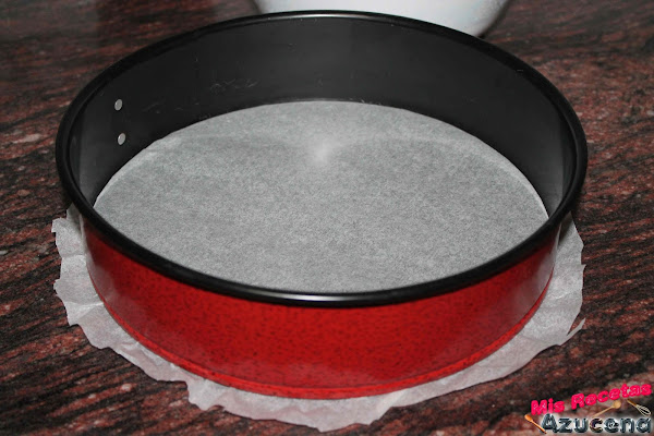 Para esta receta he utilizado un molde de 26 centímetros de diámetro desmoldable, le ponemos papel vegetal en la base y por los lados le pondremos spray antihaderente o mantequilla con harina, reservamos.