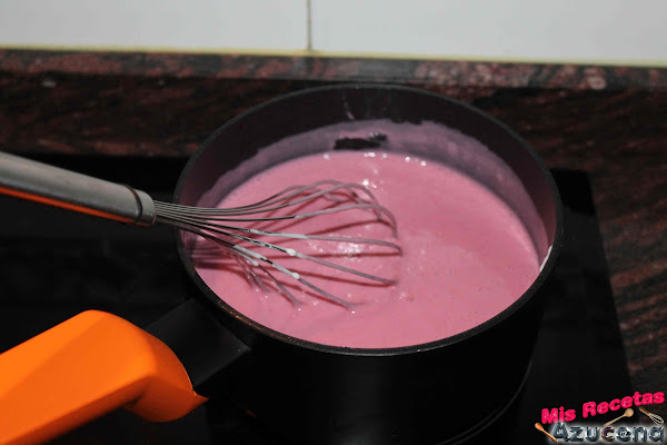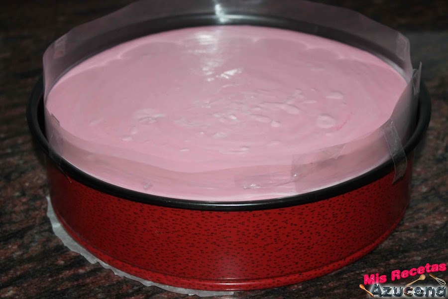Ahora cogemos el molde que tenemos con el bizcocho y añadiremos esta mezcla y metemos en la nevera un mínimo de 4 horas.