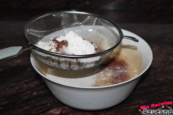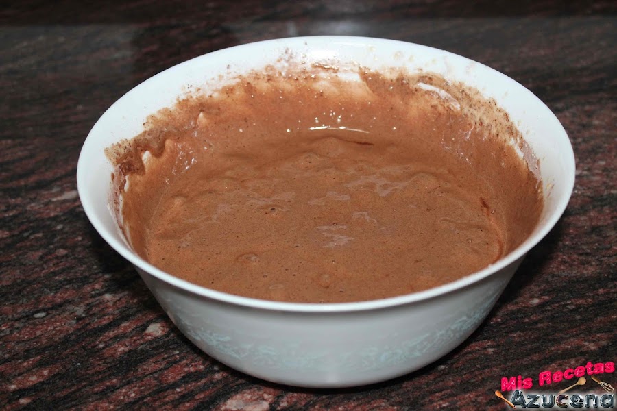 En un bol cascaremos los huevos, añadiremos el azúcar y el agua, con ayuda de unas varillas batiremos todo hasta que los huevos queden espumosos y el azúcar se haya disuelto, con ayuda de un colador y sobre este mismo bol tamizaremos la harina, la maicena, el cacao, la levadura y la sal.