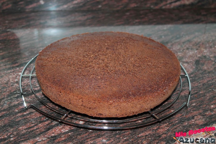 Cuando el bizcocho este tibio lo delmoldaremos y lo dejaremos enfriar sobre unas rejillas, hasta que no este bien frio no podremos continuar con la receta.