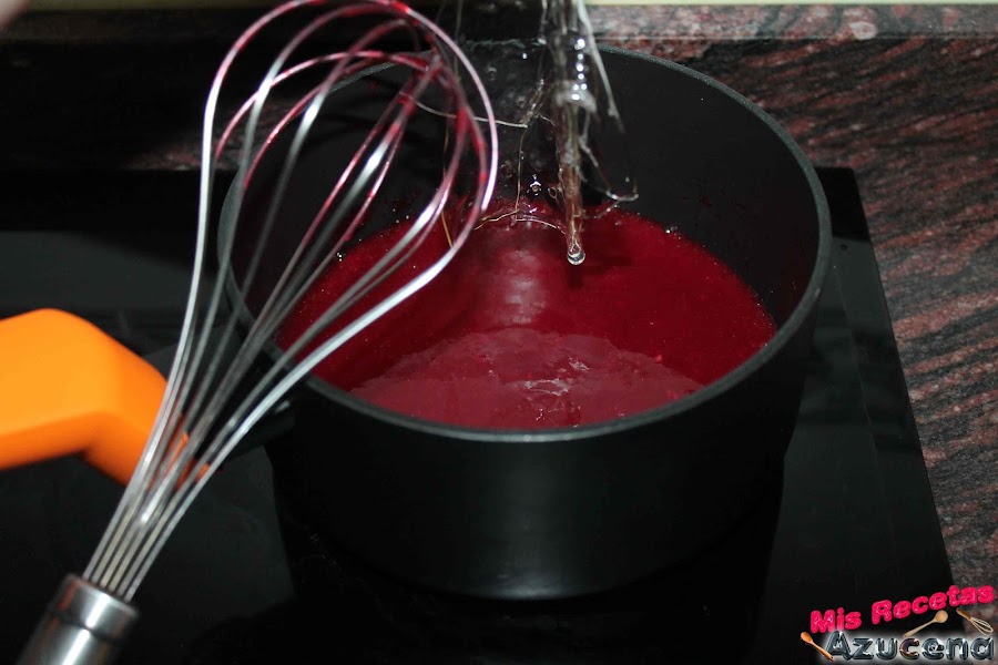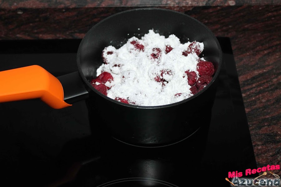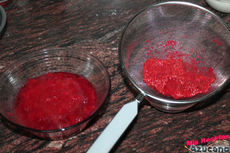 el resto, las ponemos en un cazo junto con el azúcar glass y lo pondremos al fuego a fuego medio bajo unos 12 minutos, pasado ese tiempo las retiramos del fuego y nos preparamos un bol y un colador por donde pasaremos las frambuesas para eliminar las semillas.