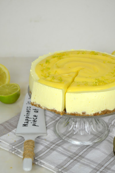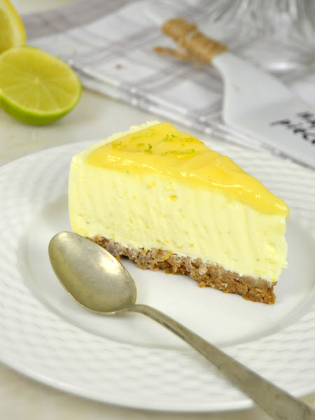 6.- Esta tarta puede servirse así tal cual pero para darle un toque aun más rico a nosotros en casa nos gusta ponerle por encima una capa de crema de limón o lemon curd. Lo podeis comprar o hacerlo en casa. Esta es nuestra receta de crema de limón al microondas rápida, con la mitad de los ingredientes de la receta será suficiente para cubrir la tarta. Solo queda decorar con un poco de ralladura de limón y lima ¡Y a disfrutar!