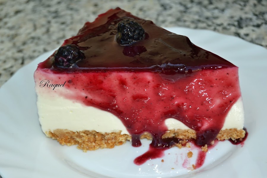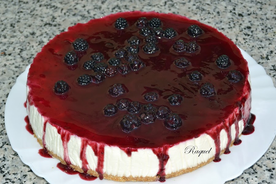 Como ya os dije cuando publique la mermelada de moras silvestres que pronto publicaría la tarta que hice con ella. Fue en agosto para mi cumpleaños y como os dije cogí las primeras moras, fue ahí cuando hice por primera vez esta mermelada con ellas, no me había imaginado lo rica que estaba hasta que la probé. Así que tenia claro que este año mi tarta de cumpleaños llevaría de este rico manjar, prepare una tarta fría de yogur griego y la bañe con ella y sobre ella añadí unas cuantas moras mas que tenia congeladas.