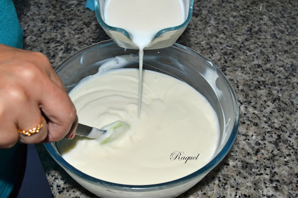 Mezclamos el yogur con el azúcar, después añadimos la leche que ya se abra enfriado y mezclamos bien.